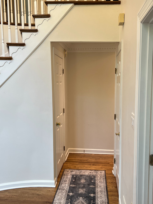 Here is a before and after of the same hallway where we changed floors, doors, and added detailed molding!